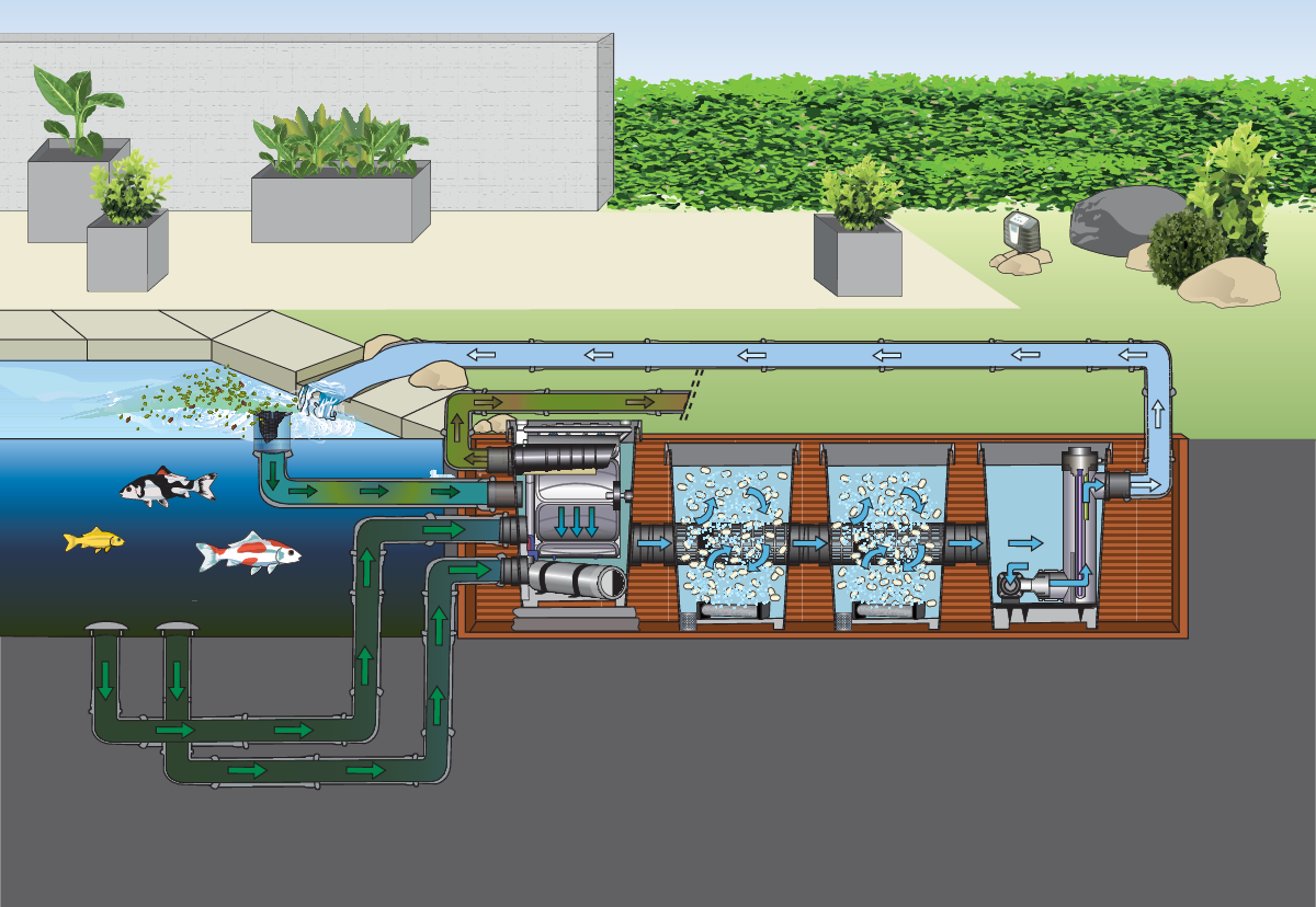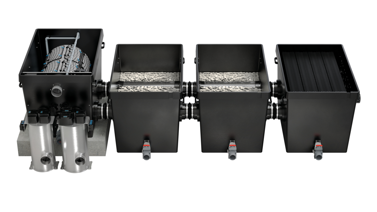 Auch eine hohe Abscheideleistung und ein geringer Platzbedarf zeichnen eine kompakte Alternative für kleinere Teiche bis 140 m³ aus. Eine Tiefenfiltration von bis zu 60 µm ist möglich.